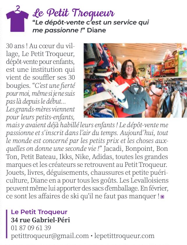 En FĂ©vrier 2024, Le Petit Troqueur a eu lâhonneur dâĂȘtre mis Ă lâhonneur dans le magazine Info Levallois, Ă lâoccasion des 30 ans de la boutique.